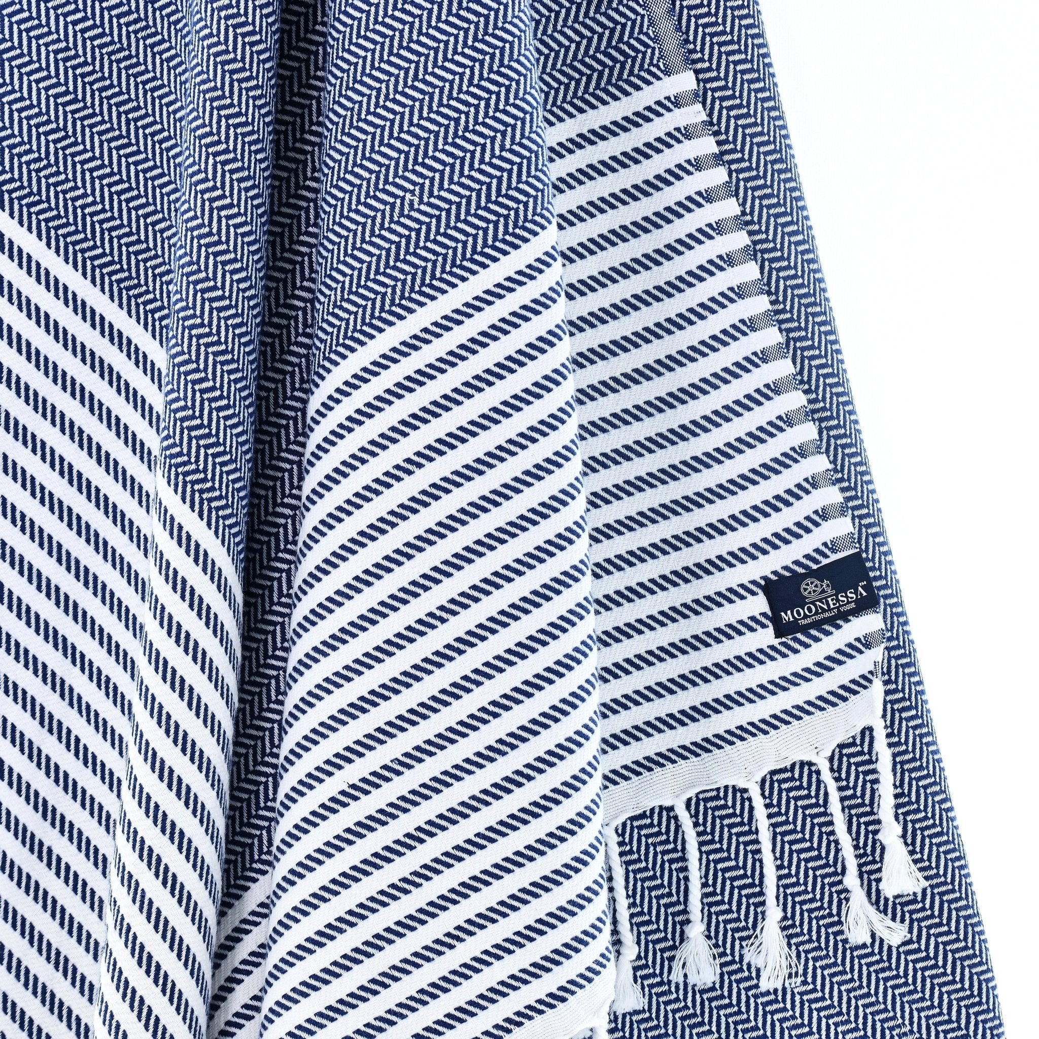 | Design | Navy with a crisp white herringbone pattern and delicate edge stripes |